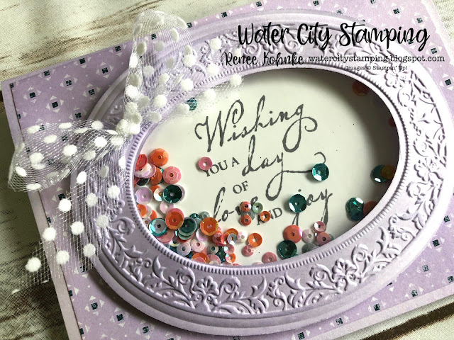 Now for a more whimsical card...I worked with the Purple Posy patterned Designer Paper and Cardstock. Using the Oval Framelit and embossing folder, I decided to make it a shaker card.